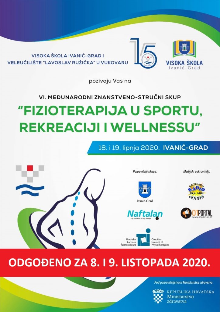 VISOKA ŠKOLA IVANIĆ GRAD I VELEUČILIŠTE „LAVOSLAV RUŽIČKA“ U VUKOVARU pozivaju Vas na VI. MEĐUNARODNI ZNANSTVENO-STRUČNI SKUP“ FIZIOTERAPIJA U SPORTU, REKREACIJI I WELLNESSU koji će se održati 8. i 9. listopada 2020. godine u Ivanić-Gradu.
